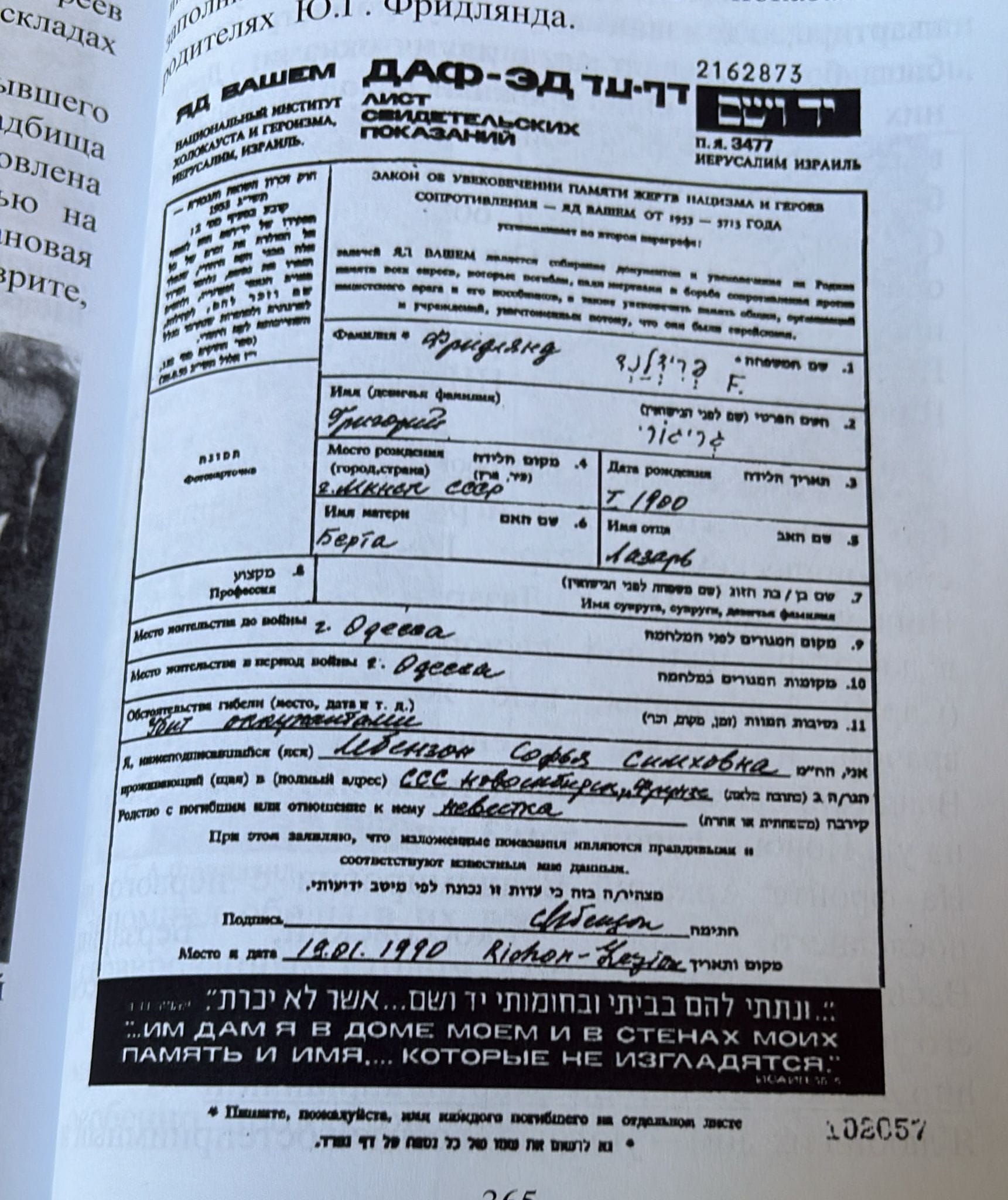 After the war, Yuliy Friedland returned to Odessa to his home, where people who lived in his house recognised him... Of all the boys in the class where my parents studied, only three survived. One, Marik Torban, they later met. In 1990, my mom, Sofya Lebenzon, filled out a testimony sheet at Yad Vashem about the fate of Yuliy Friedland’s parents.