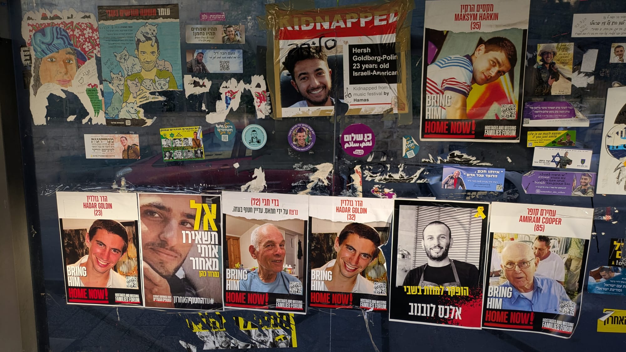As soon as we landed it became all very real–this was a country at war to free Israelis. Photographs of hostages and of soldiers, policemen and civilians killed by Hamas since October 7th, were visible from the start, the moment you enter Israel. In different format and different media, their photographs–together with banners declaring “Bring Them Home”–were present wherever we went.