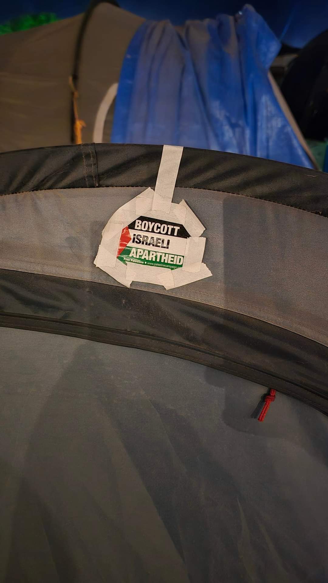 Unfortunately, some of the people I went with to the festival–including some I had considered friends–were unsympathetic to my gesture of grief. When I put up the flags next to my own tent, they asked me to take them down, citing concerns about "irrational people" associating their tents with mine and vandalising them. When I refused, they 'decorated' their own tents with some Palestinian merch, including a Boycott Israeli Apartheid sticker, presumably to 'protect' them.